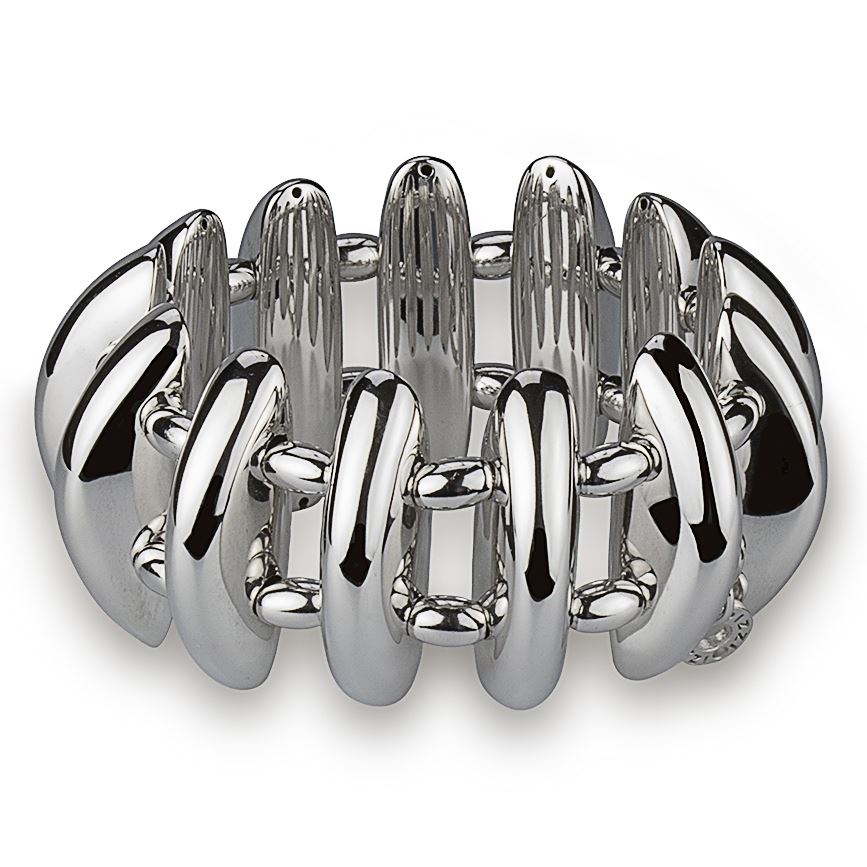 Das polierte Stretch-Armband aus der Tribali-Kollektion, handgefertigt aus 925er Silber mit Rhodium-Finish, besticht durch seinen einzigartigen und exklusiven Stil italienischer Handwerkskunst. Einfache geometrische Formen wie Baumrinde oder exotische Fruchtschalen dienten als emotionale Inspiration für die Gestaltung dieser Armbänder, die an kostbare Juwelen antiker Stämme erinnern: Romantik, Mythos und Stil vereint.