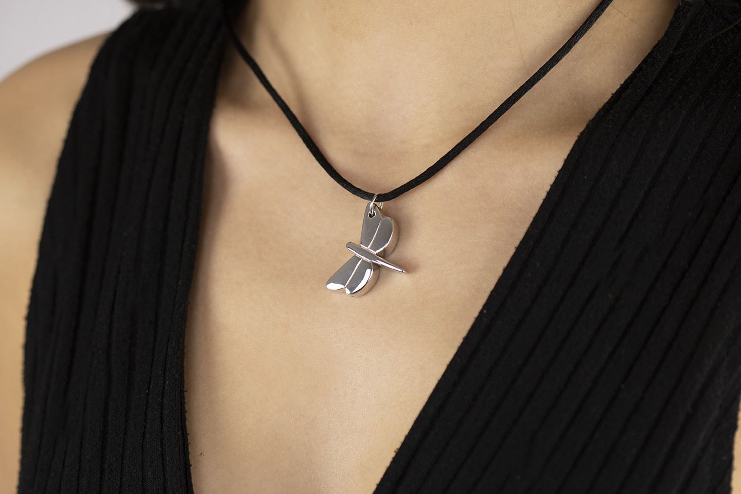 Halskette mit Libellenanhänger aus Silber. Die Kollektion „Tiere“ umfasst handgefertigte Schmuckstücke aus 925er Sterlingsilber mit Rhodium-Finish, die in Italien mit traditionellen Handwerkstechniken zu kostbaren Tierfiguren geformt wurden. Die Natur, die Schöpferin dieser Kollektion, inspirierte erfahrene Hände bei der Gestaltung dieser Schmuckstücke. Jeder kann diese wertvollen Kunstwerke mit ihren kraftvollen und wilden, zarten und feinen Formen tragen und sich von intensiven Emotionen berühren lassen.