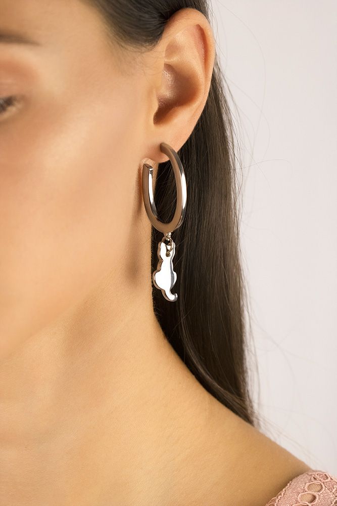 Silberne Creolen mit Katzenanhänger , Kollektion Tiere, handgefertigt aus 925er Silber mit Rhodium-Finish und hypoallergener 333er Goldnadel, hergestellt in Italien.