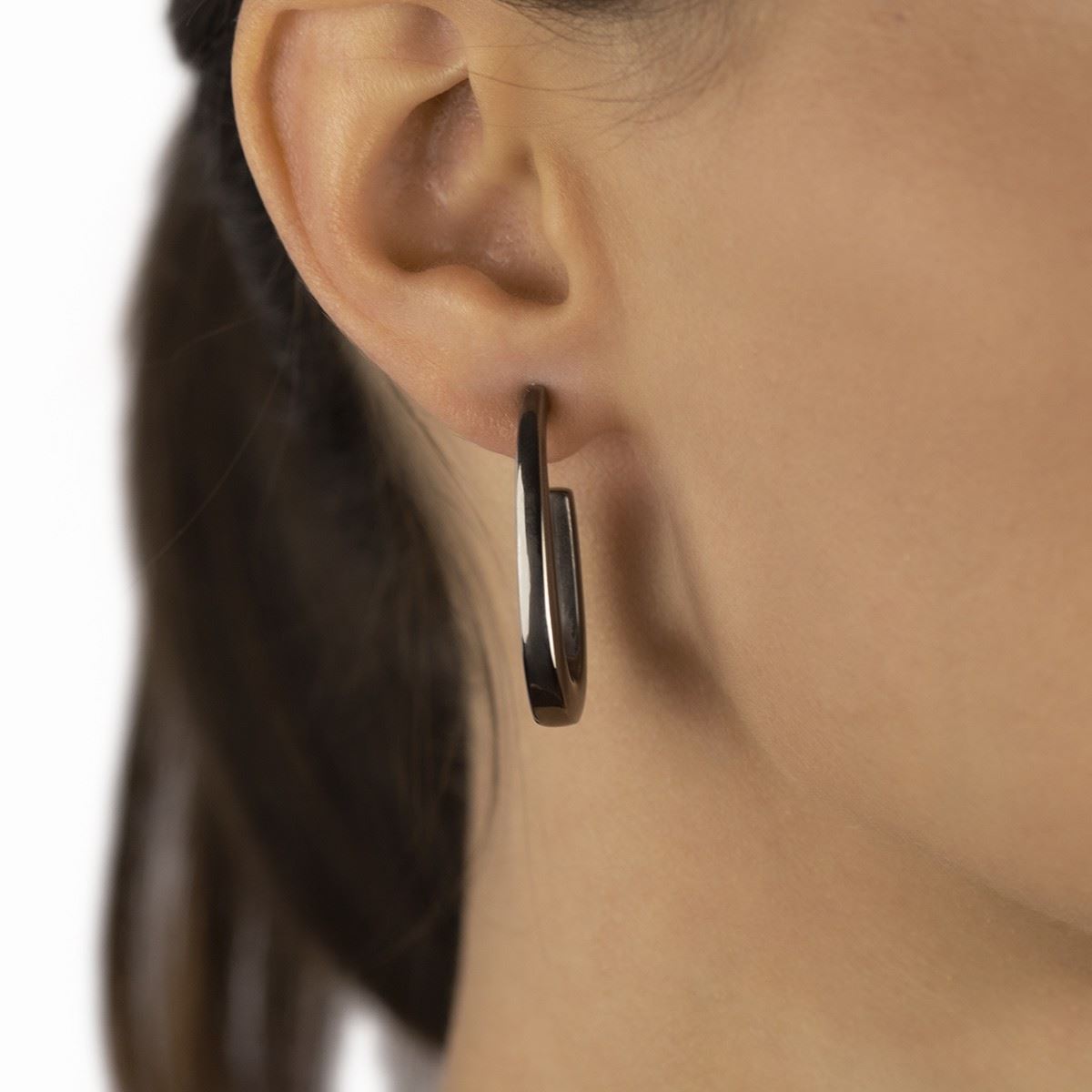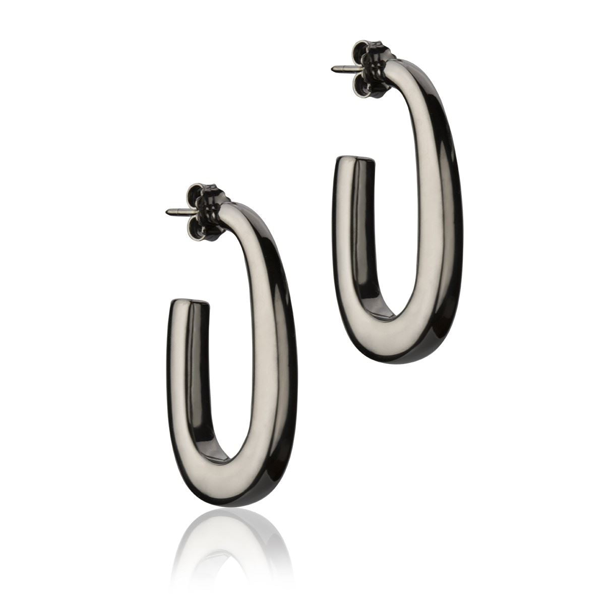 Oval earrings in ruthenium silver, square section, length 35mm , Compass collection, made of 925% silver with ruthenium finish and hypoallergenic 8kt gold pin. Made in Italy.