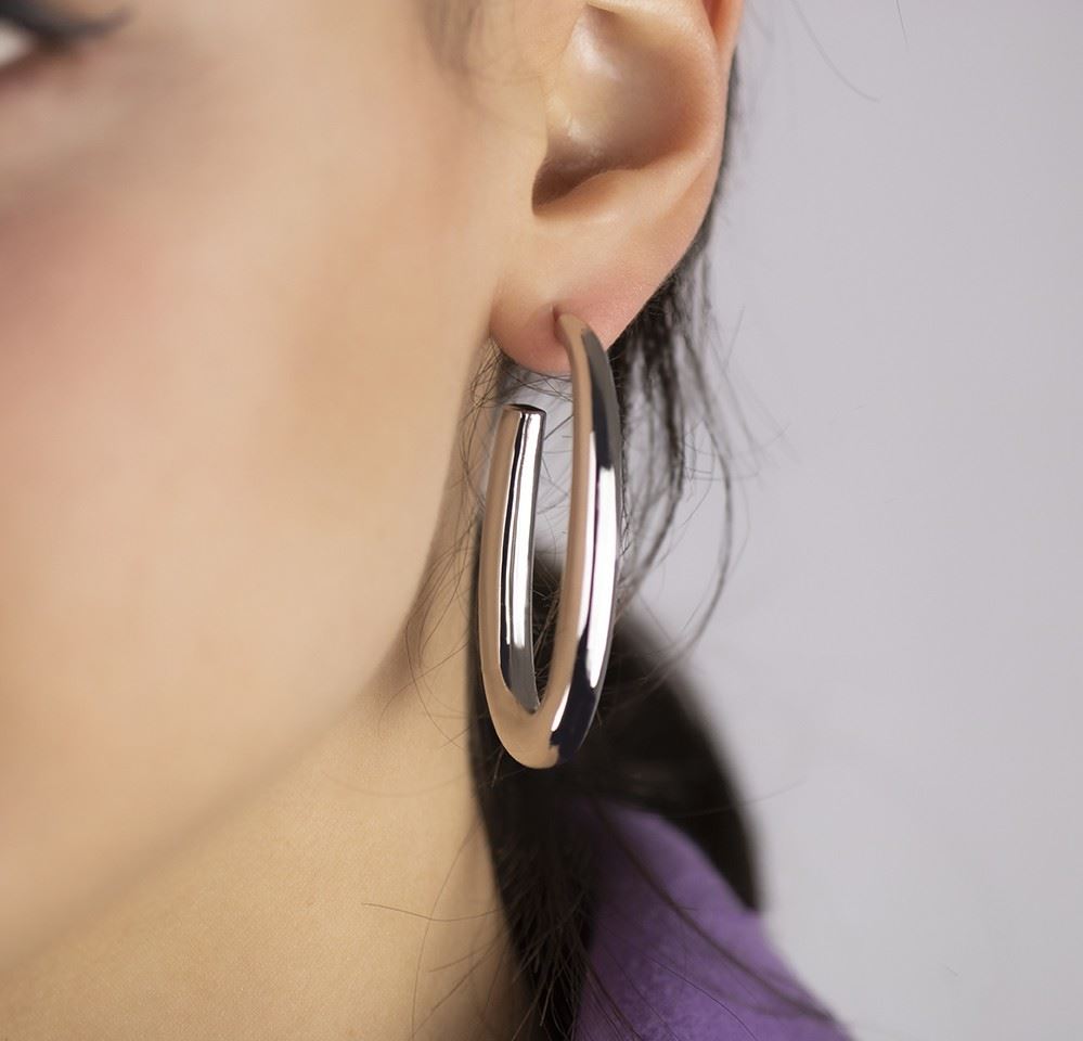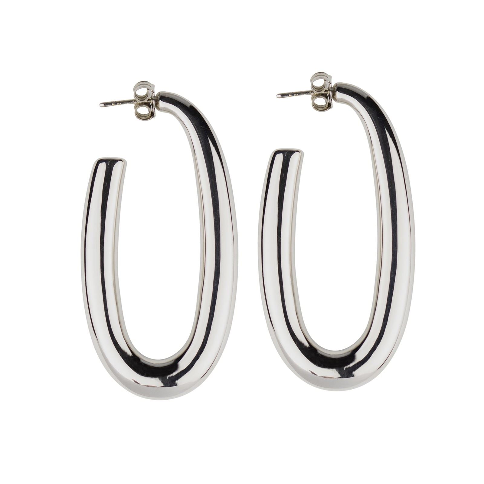 Oval silver earrings, round section, length 50mm , Compass collection, made of 925% silver with rhodium finish and hypoallergenic 8kt gold pin. Made in Italy.