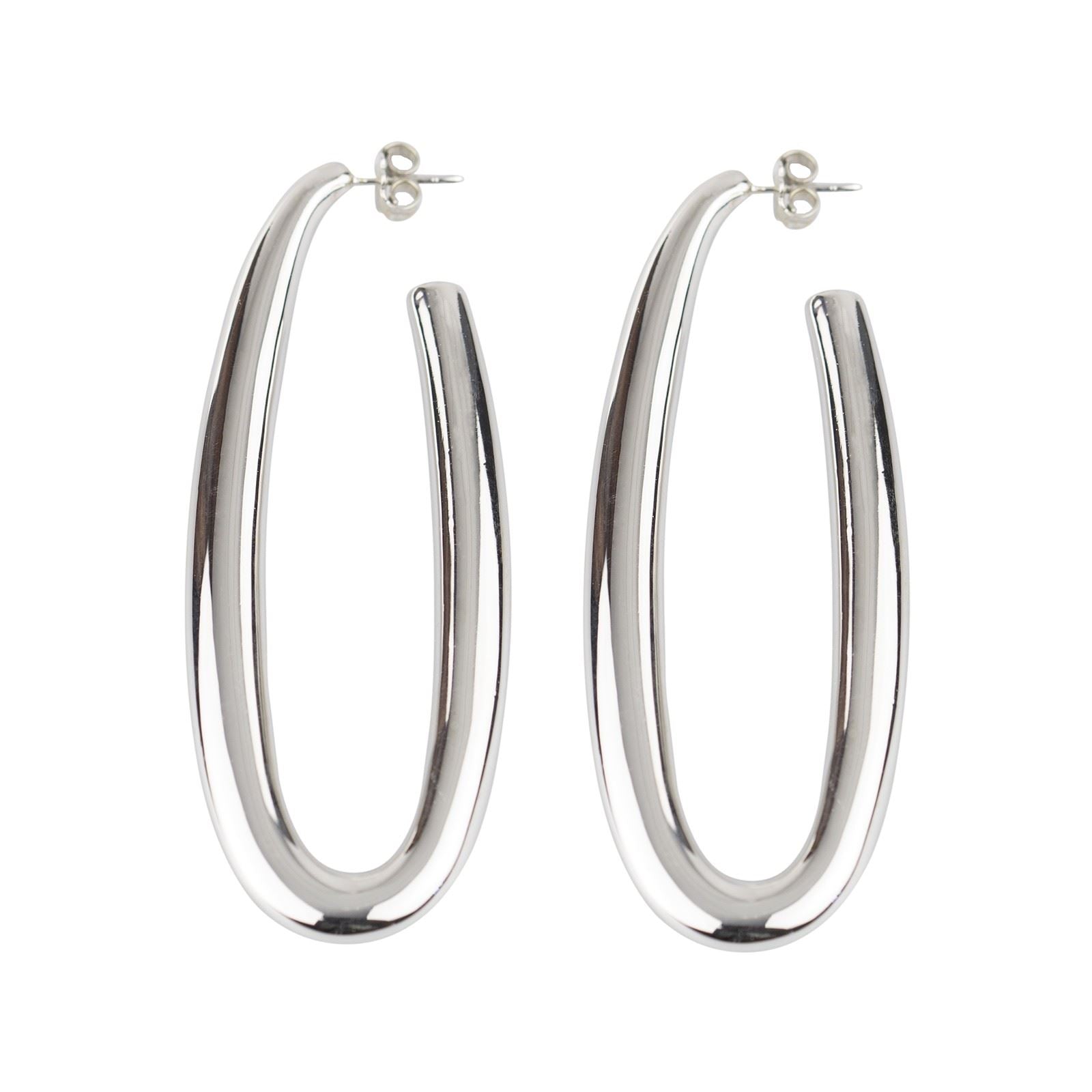 Oval silver earrings, round section, length 70mm , Compass collection, made of 925% silver with rhodium finish and hypoallergenic 8kt gold pin. Made in Italy.