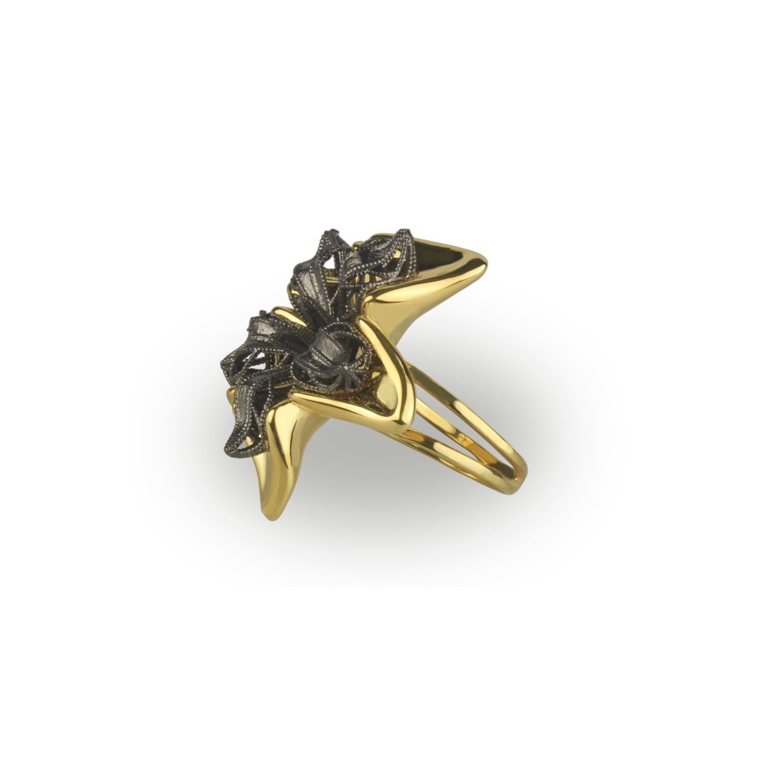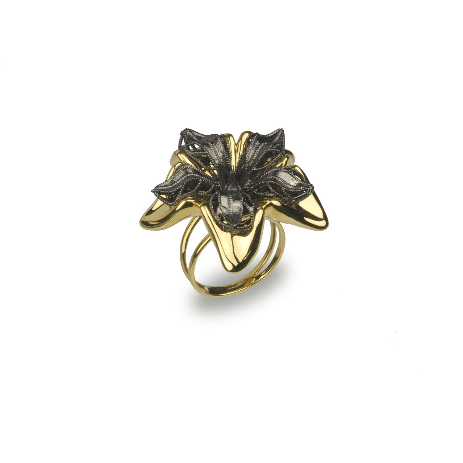 Anello Fiore in Oro Giallo e Brunito 18 k Grande , collezione Butterfly, realizzato artigianalmente con lavorazioni interamente a mano in oro giallo a titolo 750%° e oro brunito a titolo 750%° creano un prezioso gioiello per farvi emozionare..