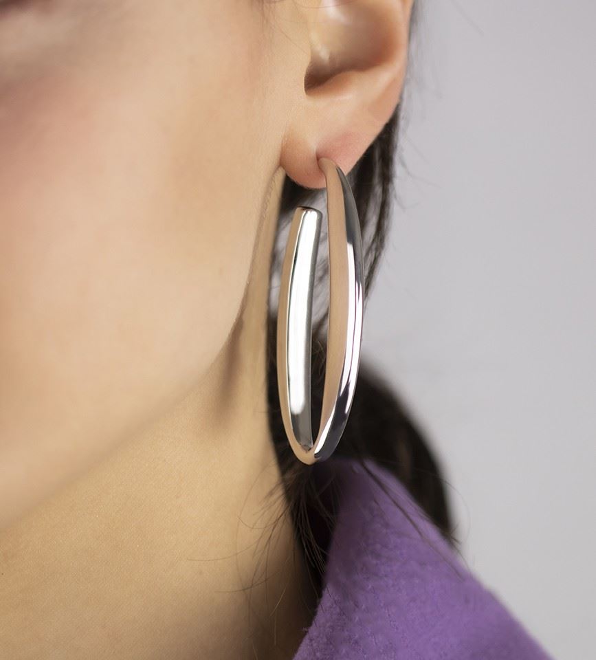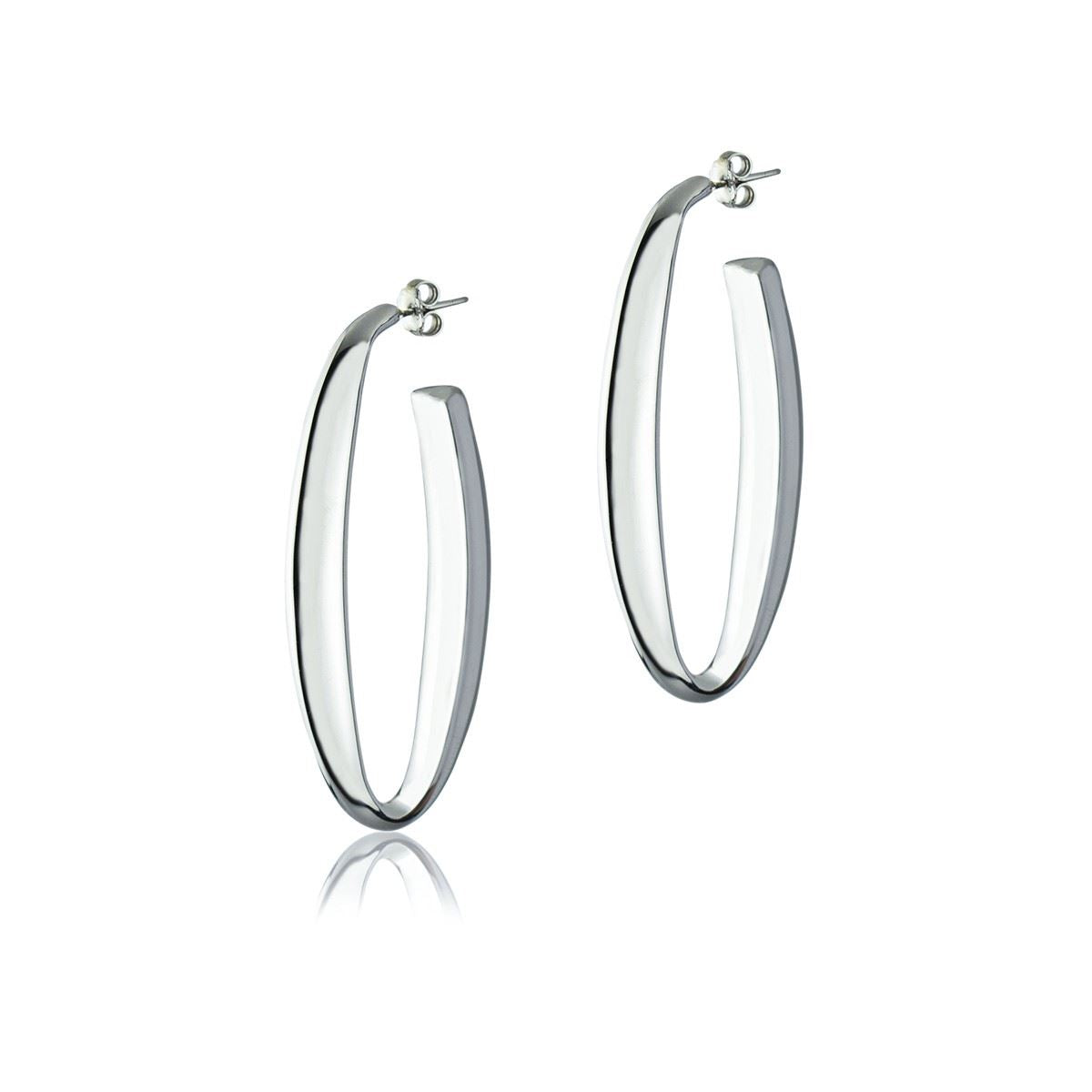 Orecchini ovali in argento sezione triangolare lunghezza 60mm, collezione Compass realizzati in argento a titolo 925%° con finitura rodiata e perno in oro anallergico a titolo 8 kt ● Made in Italy.